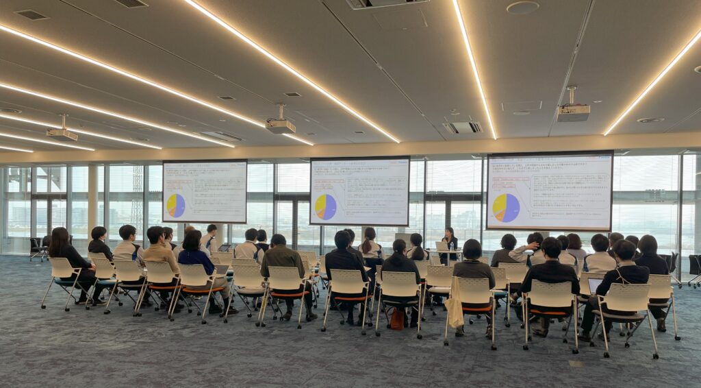 子育て中の社員や、将来のライフイベントに不安を抱える若手社員、子育て中の部下を支えるマネージャー層など、多様な立場の150名以上の社員が参加。セミナーは1日にわたる2部構成で行われ、参加者はそれぞれの立場から「キャリアとライフイベント」「部下との向き合い方」「限られた時間での成果の出し方」についてじっくりと考える濃密な時間を過ごしました。