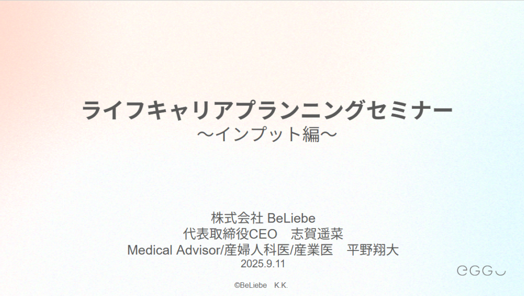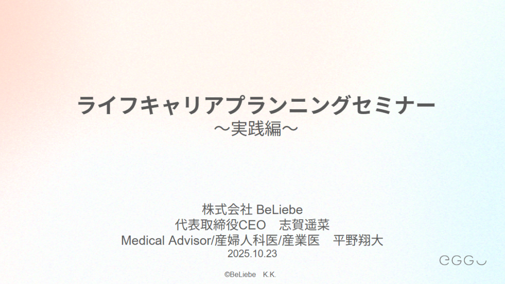 2025年9月11日と10月23日、三菱商事従業員組合(以下、三菱商事)主催の「ライフキャリアプランニングセミナー」が二部構成(第一部:基礎知識編、第二部:実践編)で行われ、株式会社BeLiebe(以下、BeLiebe)の代表取締役 志賀遥菜、及び産婦人科医・産業医である平野翔大先生が登壇しました。